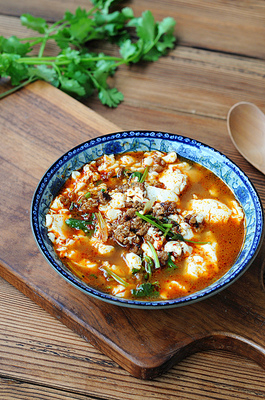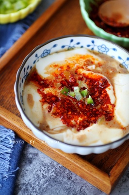 他们家的豆腐脑是老做法,磨好的黄豆浆点得嫩,用勺子舀起来能晃悠悠颤两下,却不碎。浇上的卤料是灵魂——香菇丁、木耳丝、黄花菜泡得软乎,和肉末一起在锅里熬得稠稠的,浇在豆腐脑上,再撒把切碎的香菜和榨菜丁,最后淋勺红亮亮的辣油,光闻着就醒神。
